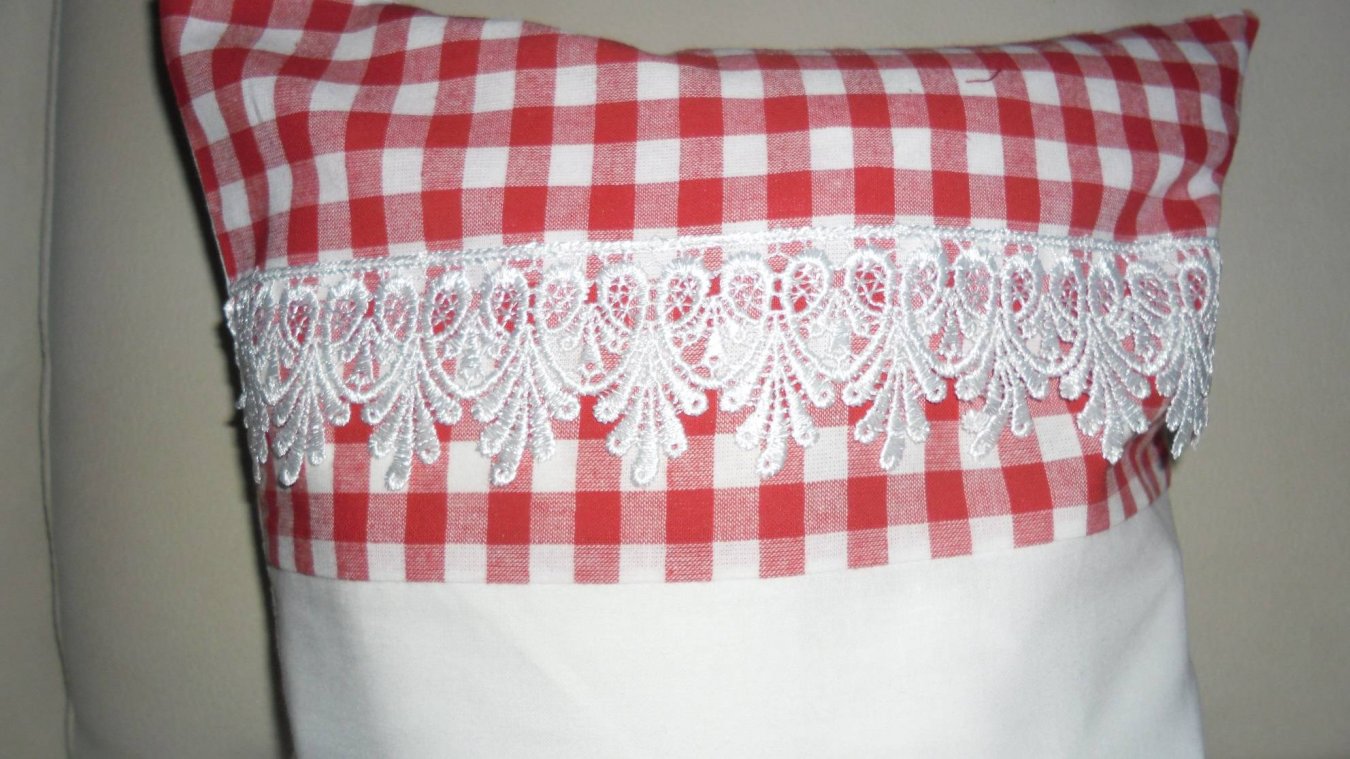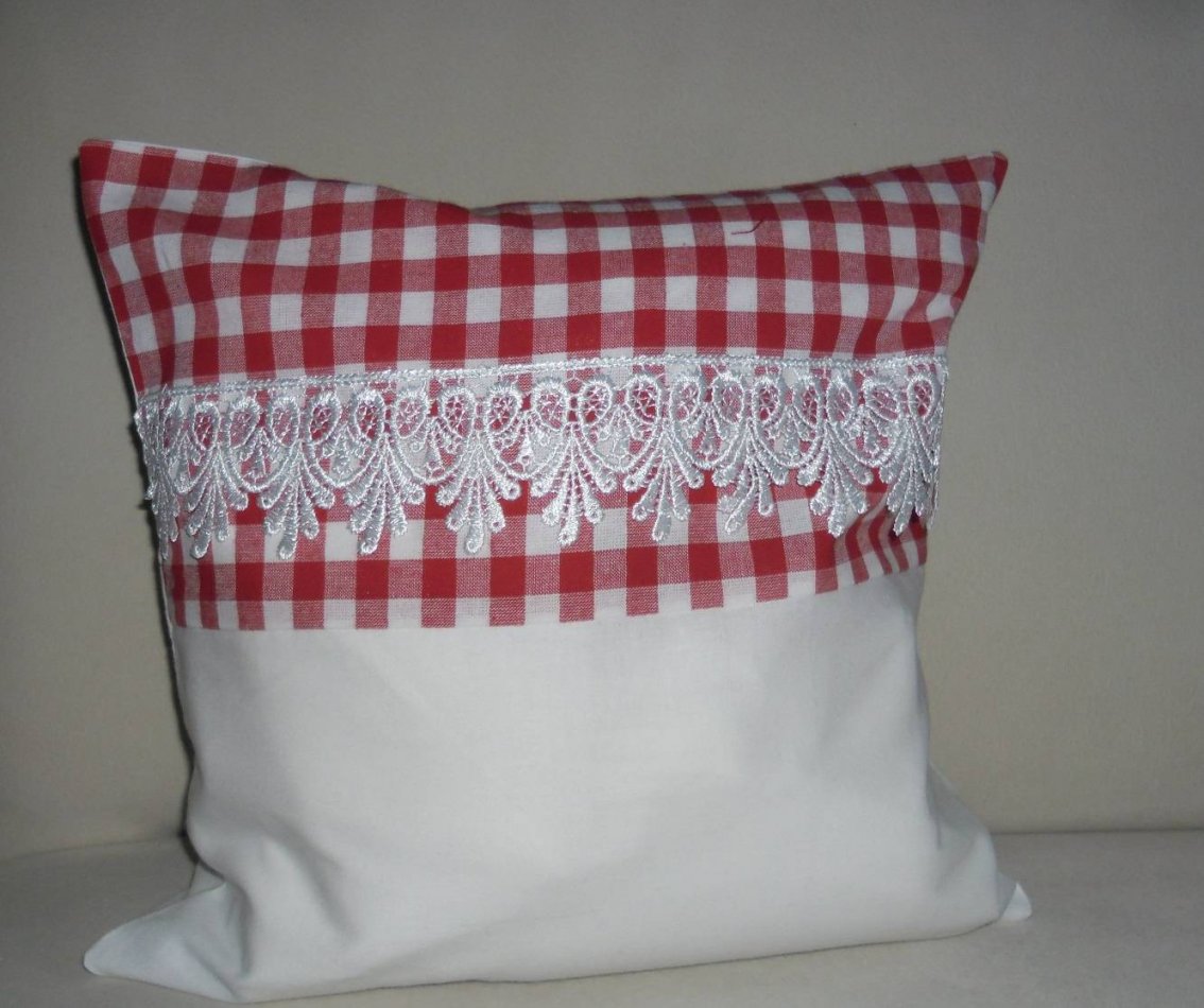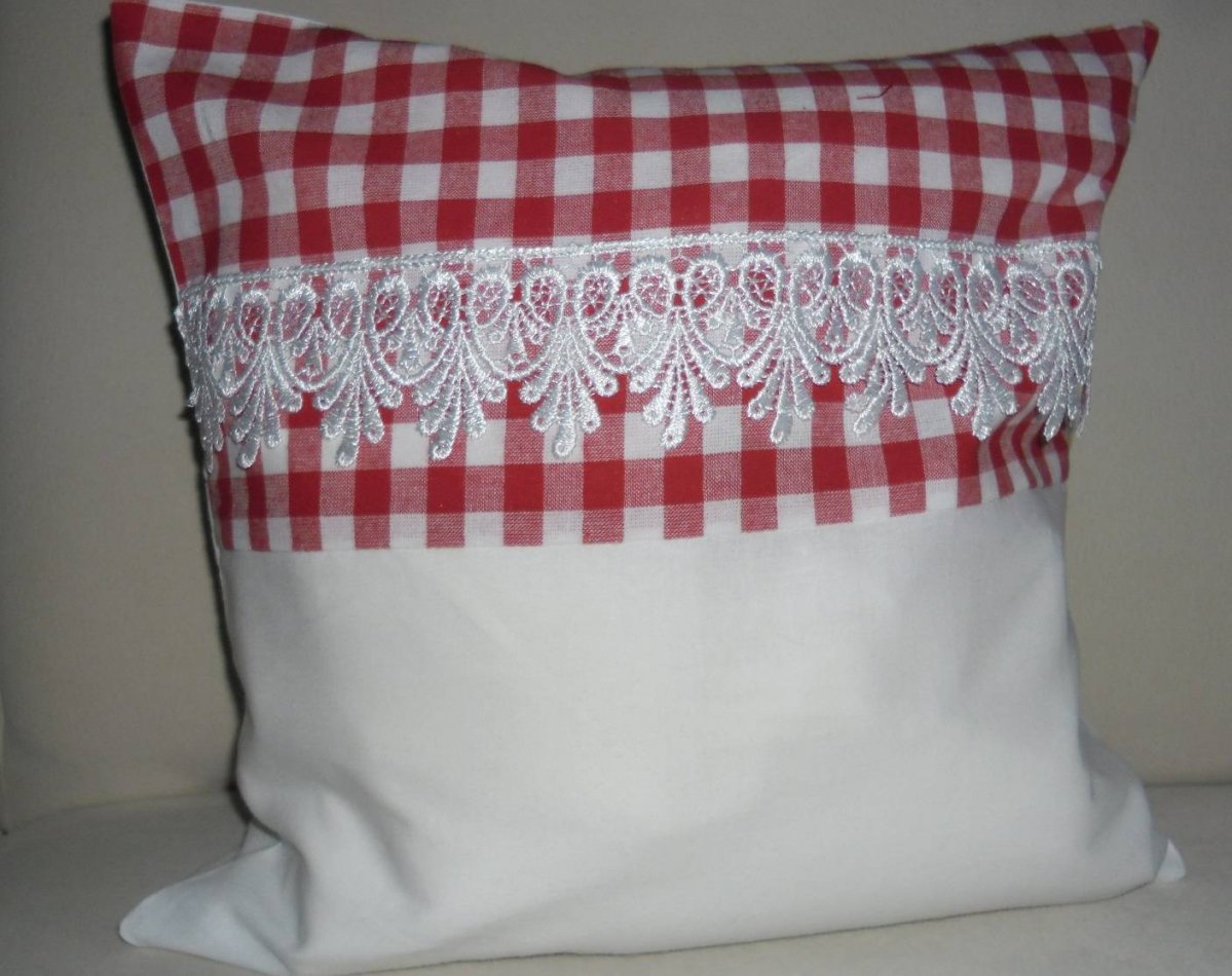 Polštářek je vyroben z bíleho bavlněného materiálu. Na vrchu polštáře je bavlněná krajka. Na zadní straně knoflíky.