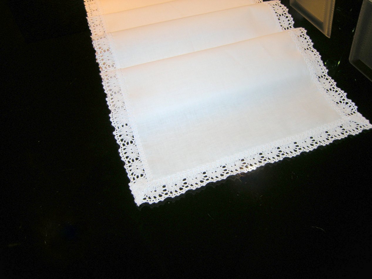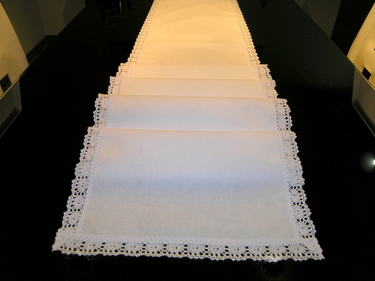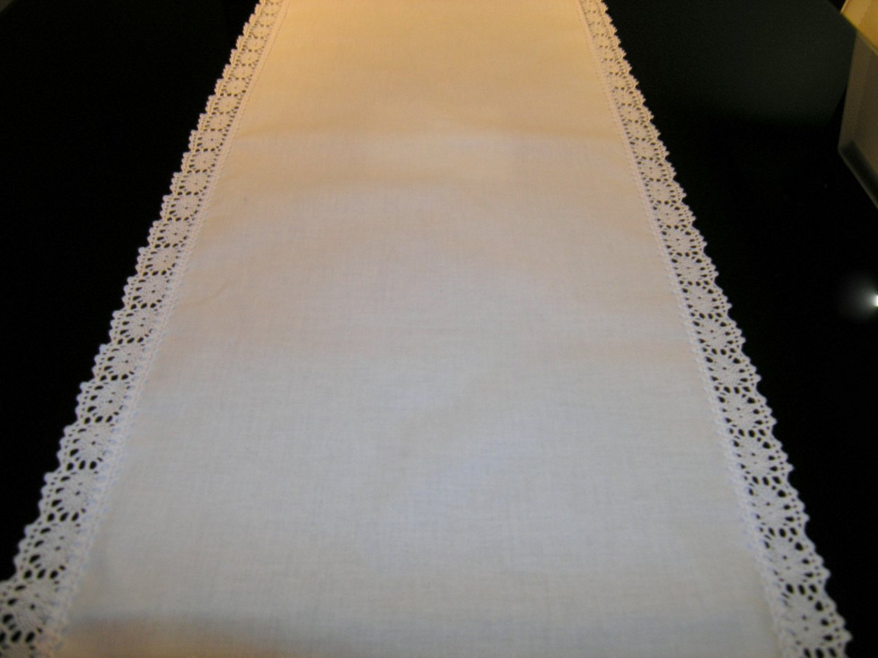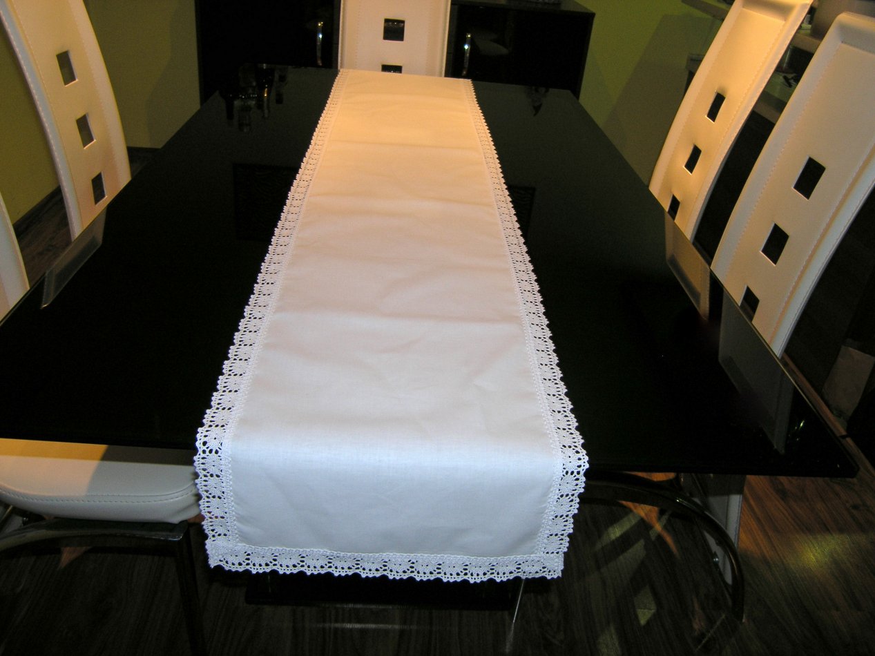 Vintage běhoun vyrobený z bílého plátna zútulní každý interiér. Zdobí ho romantická paličkovaná krajka, která se může mírně lišit od zobrazené krajky z důvodu skladových zásob.