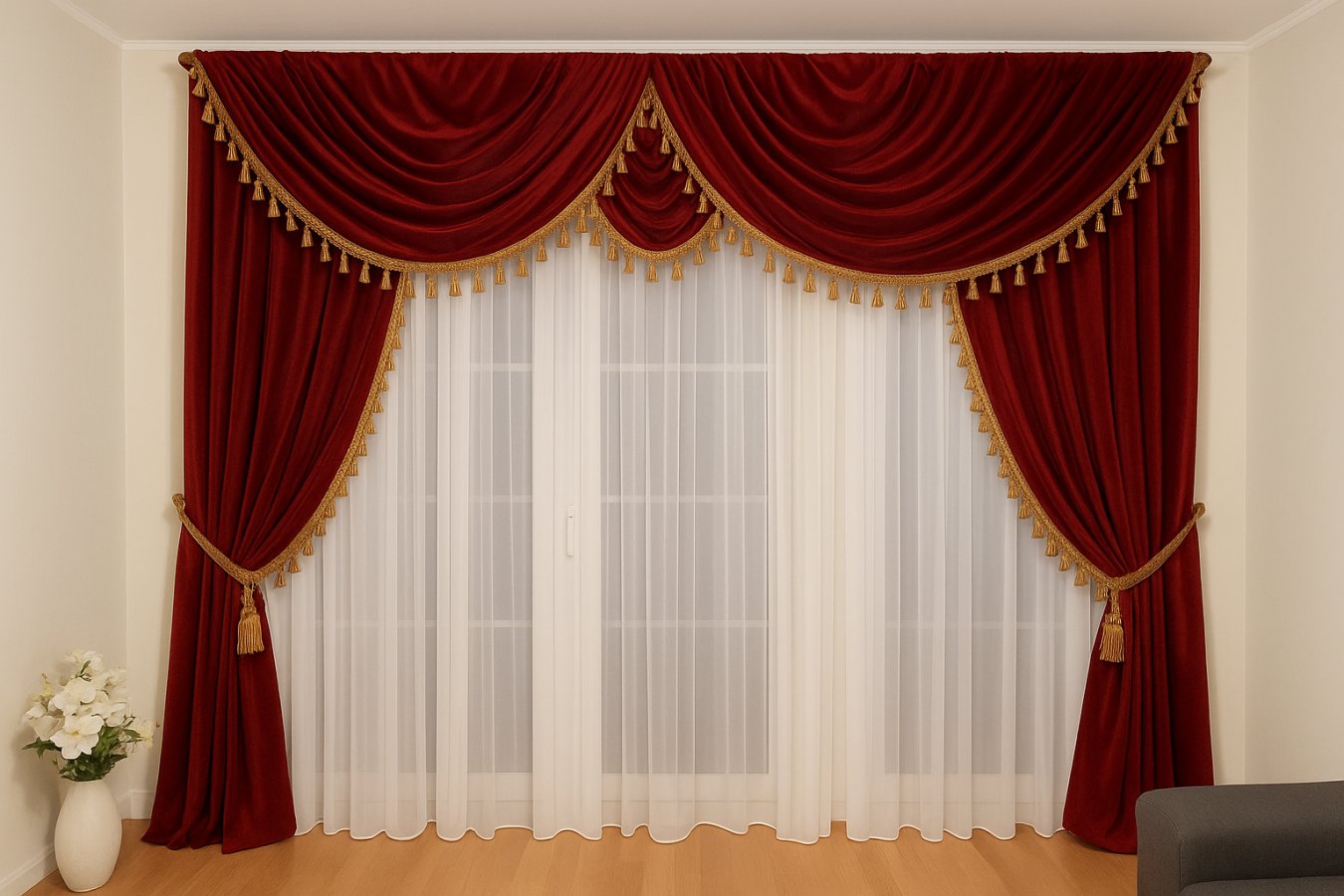 Vrchní část je napevno naskládaná, olemovaná zlatými třásněmi a našitá na tunelové pásce, stačí jen navlét na garníži. Průměr garnýže Max. 3 cm